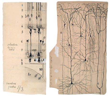 Dibujos de Ramón y Cajal. Izda: esquema de las capas y anillos neuronales de la retina de los vertebrados. Dcha: Primera, segunda y tercera capa de la circunvalación frontal ascendente del niño. En Santiago Ramón y Cajal. Epistolario (La Esfera de los Libros). © Herederos de Santiago Ramón y Cajal