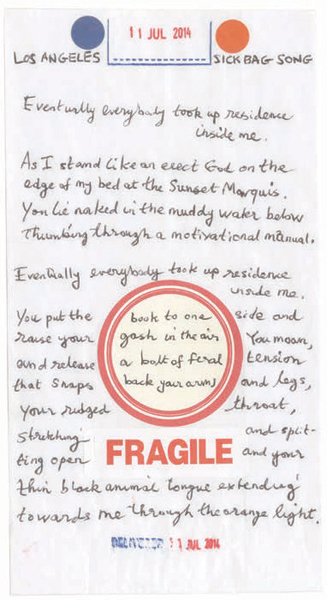La escena queda plasmada en una bolsa de papel, de esas que dan en los aviones para vomitar. Durante su gira norteamericana del verano de 2014 junto a su banda The Bad Seeds, el cantautor australiano (Warracknabeal, 1957) tuvo a su disposición muchas bolsas y mucho tiempo para plasmar ideas de todo tipo. Con ellas compuso La canción de la bolsa para el mareo, a caballo entre el cuaderno de viaje, la epopeya, la alegoría apocalíptica y el autopsicoanálisis. En palabras del propio Cave, el libro es "una mezcla de poema de carretera y relato de terror, como si se juntaran Carretera al infierno y el Libro de los salmos" y una larga lista de referencias de todo tipo -de la Odisea a PornHub- con las que el músico, escritor y actor intenta explicar(se) el sentido de esta extraña composición. El libro lo publica en España Sexto Piso, traducido por Mariano Peyrou y acompañado de imágenes de las bolsas originales manuscritas por Cave, que actuará en Barcelona y Madrid los próximos 21 y 22 de mayo.