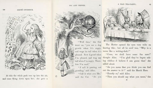 Tres páginas de la primera edición de Alicia en el país de las maravillas
