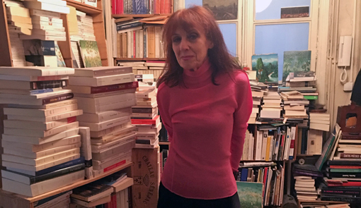 Annie Le Brun en su casa, rodeada de libros. Foto: J. C.