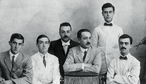 Los miembros de la "peña malagueña" fotografiados en 1908. De izquierda a derecha: José Moreno Villa, Francisco de Orueta, Manuel García Morente, Ricardo de Orueta, Alberto Jiménez Fraud y Gustavo Giménez Fraud. Foto: Archivo Residencia de Estudiantes, Madrid.