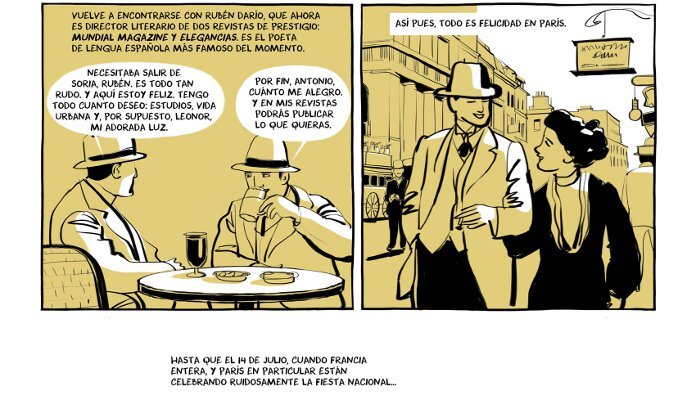 “Con Lorca sucedió que interesó también a mucha gente que no pertenecía al mundo del cómic –interviene Quique Palomo-. Sobre todo a gente del marco de la docencia. Por ejemplo, en torno al tema de la memoria histórica, hubo mucho interés con él. Y ahí, Machado va a interesar todavía más. También para hablar de este periodo político de España”. Es la España del Regeneracionismo y su interés por una renovación cultural. No podían faltar, por tanto, figuras como Ortega y Gasset o Unamuno. "Son personajes que están intentando que haya cambios, un pensamiento distinto, más crítico", continúa. Junto a ellos, Gregorio Marañón, Pérez de Ayala, el propio Lorca se pasean entre sus páginas en búsqueda de esa renovación.