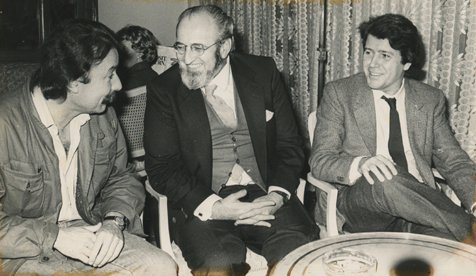 Juan Cueto (miembro del jurado), Álvaro Pombo (ganador) y Jorge Herralde en el I Premio Herralde de Novela. Barcelona, 1983