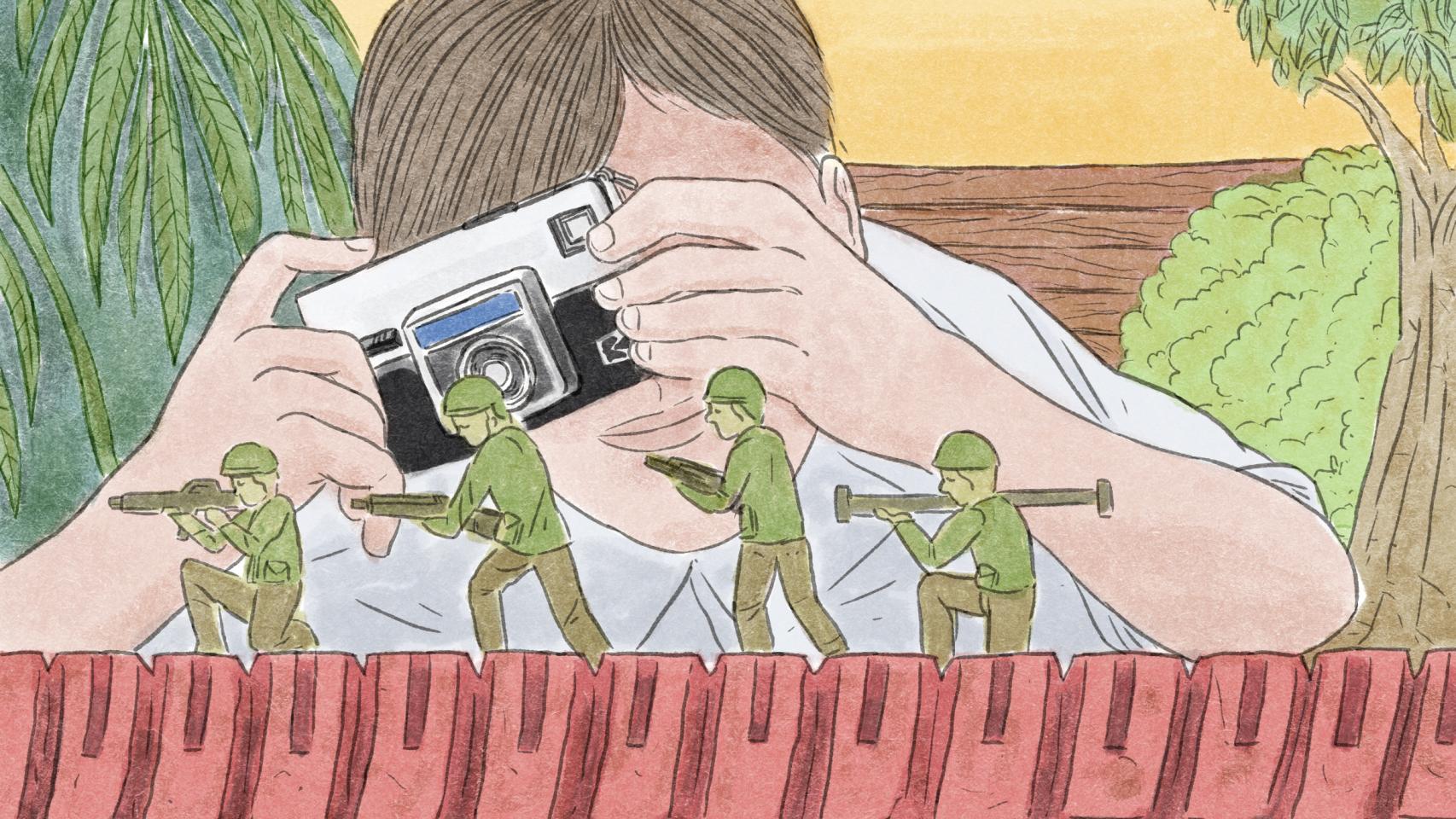 Ella finalmente se marchó con las fotos aún en su mano. No logré ni verlas. No pude responderle nada a mi madre. Nunca llegué a explicarle que esas primeras fotos habían sido en realidad la secuencia de una historia de soldados y guerrilleros enfrentándose en un arenero rojo, una historia de guerra que me había imaginado y que quería contar.