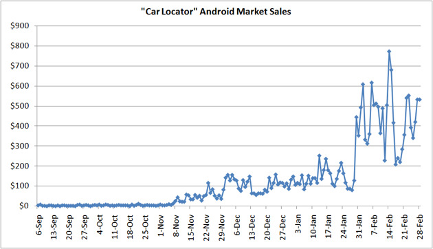 El desarrollador de la aplicacion Car Locator (Edward Kim) está ganando $13.000 (9.515,44 €) al mes, una media de 80 a 100 dólares diarios, subiendo a 435 cuando fue incluida en la categoría de destacadas.