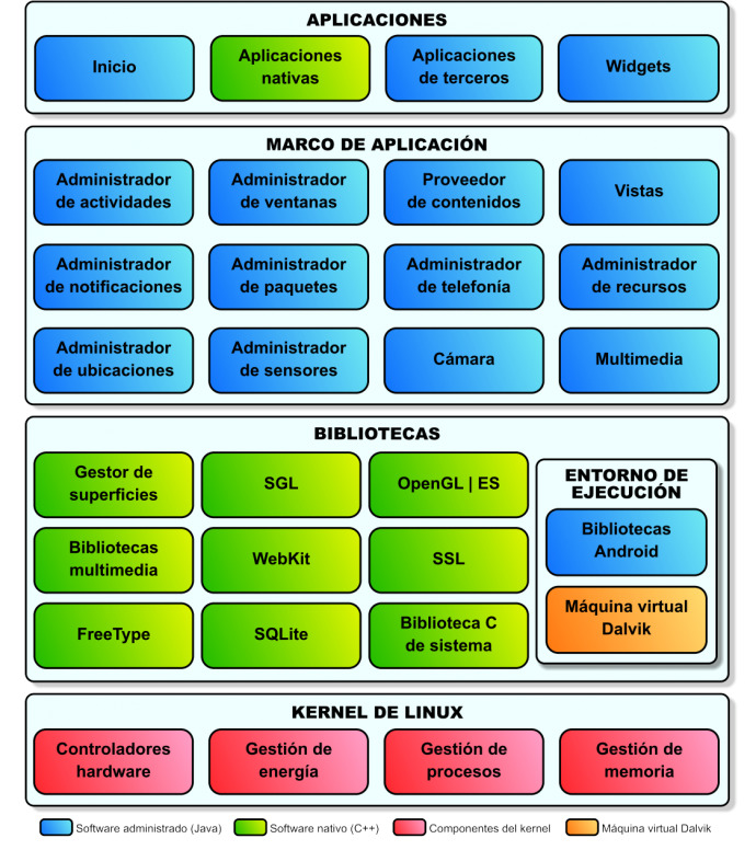 Por otro lado si tomamos como Linux el kernel en si mismo podemos decir que Android y Linux son lo mismo porque Android usa ese “motor” para funcionar. Android usa el kernel Linux como capa de abstracción de hardware. Es decir, el kernel se usa para que los componentes de Android, la máquina Dalvik, las bibliotecas y las aplicaciones corran sobre un entorno estandarizado que no dependa del hardware. En el grafico que os muestro abajo podemos ver como el kernel es la base sobre la que se apoya todo el sistema Android.