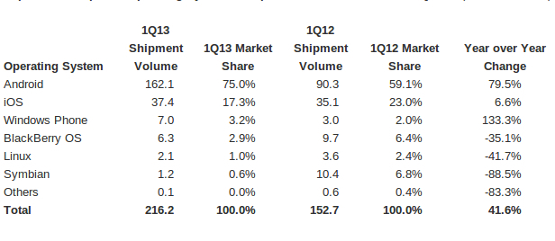 Es un largo camino el que ha recorrido Google, desde un ser considerado un smartphone para «pobres» a sacar teléfonos que miran de frente y sin desenfocar la cámara frontal al iPhone, e incluso superándolo en muchos aspectos. Pero si hay algo que diferencia Android de la competencia es la variedad, tanto en terminales como en fabricantes. Es por eso que hablar de activaciones en general no es suficiente. Así que hablemos de porcentajes de mercado: según IDC (empresa que se dedica a las estadísticas de tecnología) Android ha sobrepasado de  largo a iOS, hasta el punto que el primer cuatrimestre de 2013 el 75% de smartphones vendidos eran Android.