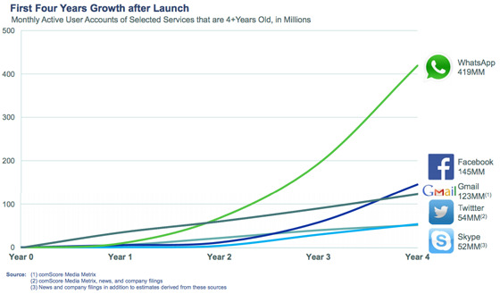 Facebook compró WhatsApp por su crecimiento imparable, sus más de 400 millones de usuarios y por ser el líder del mercado de la comunicación instantánea por encima de Facebook Messenger, su propio sistema de chat. Esto ejemplifica hasta qué punto Zuckerberg necesita estar donde esté la gente.