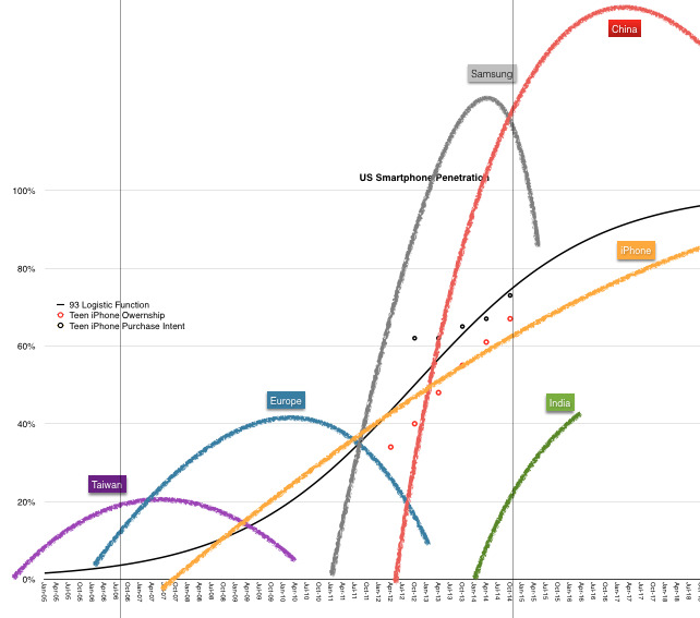 Cada época está bautizada según la zona o fabricante que ha dominado el mercado. Taiwan se refiere a la época dominada por HTC y Windows Mobile mientras que con Europa denomina a la época de Nokia y BlackBerry. Destaca especialmente cómo Samsung pasa de no fabricar prácticamente ningún smartphone a doblar a sus competidores en únicamente dos años.