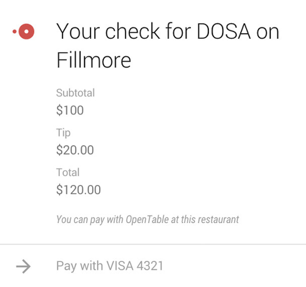 Llega ese día en el que te apetece ir a comer fuera, a un restaurante. Comes como un señor y toca el turno de pagar, ¿por qué no hacerlo directamente desde tu smartphone Android? Pero no mediante Samsung Pay, sino desde una tarjeta de Google Now. Una aplicación instalada, en este caso OpenTable, nos muestra una tarjeta de Google donde podremos pagar directamente con nuestra tarjeta asociada a Google Wallet. Terminas de comer, coges tu móvil, pagas y te marchas.