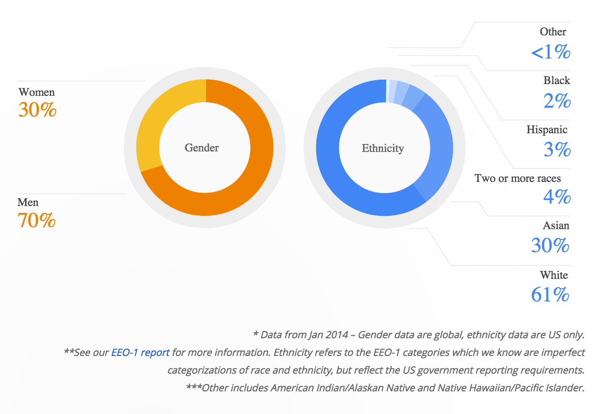 Google tiene esta opinión por un motivo muy sencillo: la diversidad, dado que la gran mayoría de empleados son blancos (el 61%, para ser exactos). Un 30% lo forman asiáticos, mientras que el resto de razas queda relegada a un 3 y 2%, y el 70% de la plantilla total está formado por hombres.