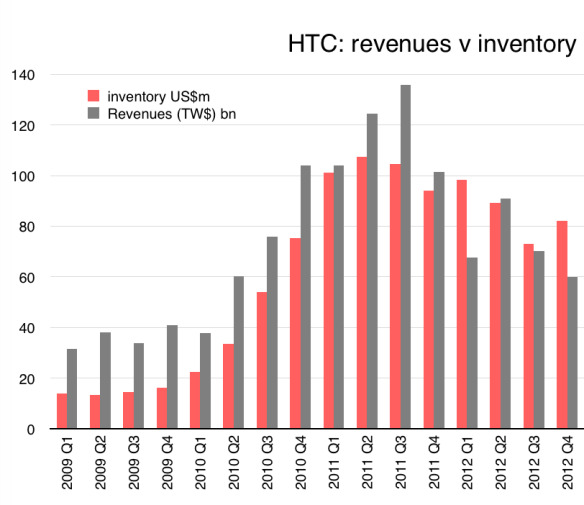 En esta primera gráfica vemos como en 2010 y 2011 fue un ‘camino de r0sas’ para HTC. Las ingresos eran muy notables y por encima del número de terminales en almacén. Incluso se había que esperar a que se repusiera el inventario para saciar las ventas entre los usuarios. Una pequeña época dorada para la firma taiwanesa.