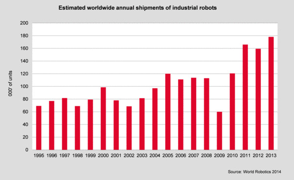 Según la Federación Internacional de Robótica, la IFR, el crecimiento de las ventas de robots para las industria aumentas cada año un poco más. El 2013 se vendieron más de 178.000 unidades en todo el mundo. En España, su crecimiento fue del 38% con respecto al 2012. Esta cifra, en unidades vendidas, es de más de 2.800. Robots comprados para agilizar el proceso de fabricación de un producto y que ha podido derivar en el despido de un número de personas de la plantilla de la empresa. Y esto, en plena crisis, no es una buena noticia para nadie.