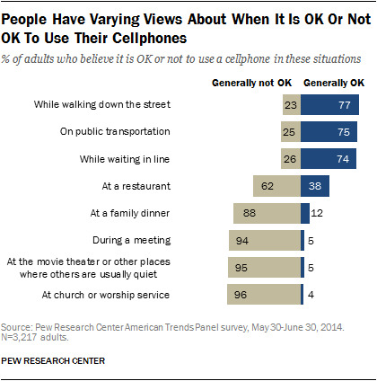 En una sociedad en la que el 76% de los usuarios no apagan su teléfono nunca o casi nunca, sólo el 38% de los encuestados piensa que está bien sacar el teléfono en un restaurante. Usarlo por la calle (77%) y en el transporte público (75%) está mucho mejor visto, pero lo peor valorado con diferencia es sacarlo en una reunión (5%), en el cine y sitios donde se esté callado (5%) o en lugares de culto religioso (4%).