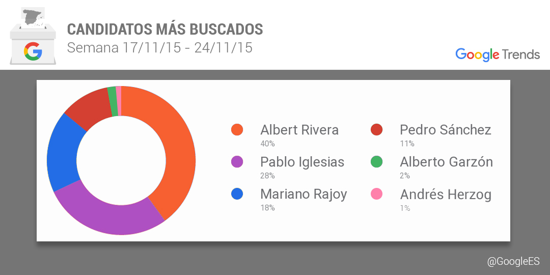 Google Trends ha analizado qué buscamos sobre ellos, qué conocemos de los principales candidatos y cuáles son las preguntas que nos hacemos. Únicamente nos ofrecen los datos más generales y las consultas más habituales, pero el gran buscador está siguiendo de cerca todo lo que buscamos. Al final, se ve a lejos a quién votaremos cada uno de nosotros. Salvo por supuesto, que seas un indeciso que busca cosas aleatorias y no tienes todavía el voto pensado. Pero tranquilo, eres una excepción. Si todos fueran como tú estos buscadores se podrían equivocar y las máquinas son perfectas.