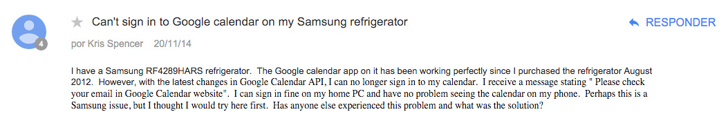 Pensadlo bien: alguien en un lugar del mundo se ha quejado en serio de que no puede entrar en Google Calendar desde su nevera. Podemos estar ante una suerte de eva mitocondrial de las quejas del futuro: «No me llegan los Whatsapps al aspirador» (y seguro que alguien le responde que Telegram es mejor), o «Al abrir Runastic en la batamanta se me cierra».