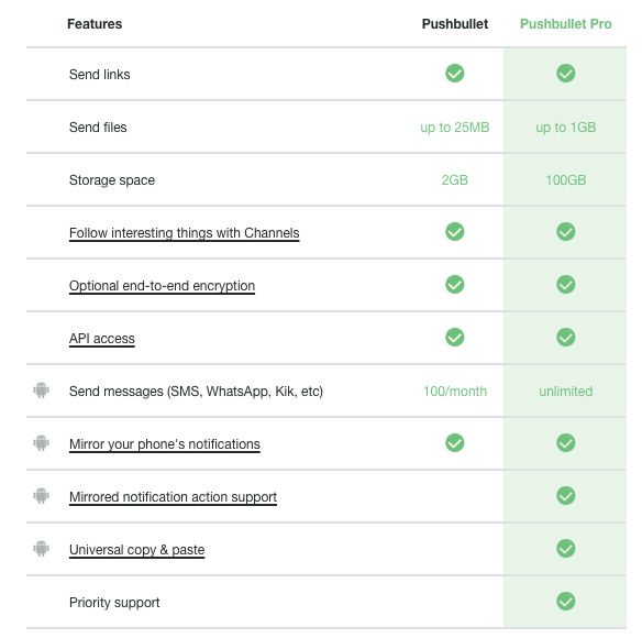La aplicación sigue teniendo una versión gratuita que mantiene gran parte de las opciones de la Pushbullet original, pero algunas funciones se han perdido y pasado a ser exclusiva de la suscripción Pro.