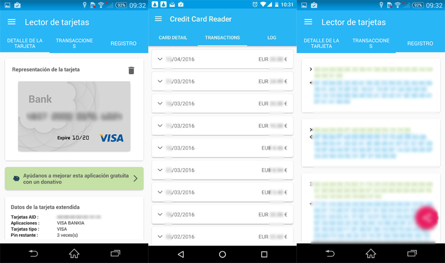 Un móvil con NFC es lo único que se necesita para acceder de forma completamente legal a todos los datos de una tarjeta de crédito o débito contactless. A través de una aplicación disponible en la tienda de Google Play, nuestro móvil puede servirnos para obtener en cuestión de un par de segundos todos los datos de una tarjeta de crédito/débito Visa, MasterCard o American Express (entre muchas otras). Esos datos incluyen no solamente el número o la fecha de caducidad, sino también las últimas transacciones que se han realizado con la tarjeta en cuestión.