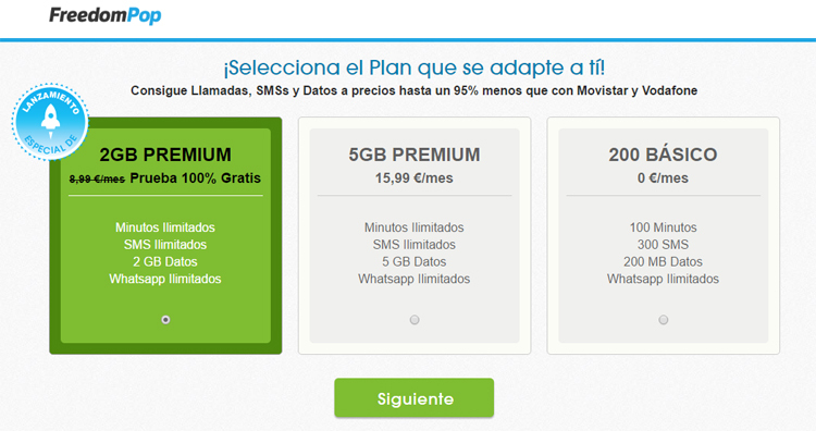 Pero comencemos por el principio. Una vez el sistema de FreedomPop confirma que tenemos acceso a la cobertura de su red, lo siguiente que tenemos que hacer es escoger la tarifa que queremos contratar. A nosotros se nos mostraban tres modalidades diferentes: