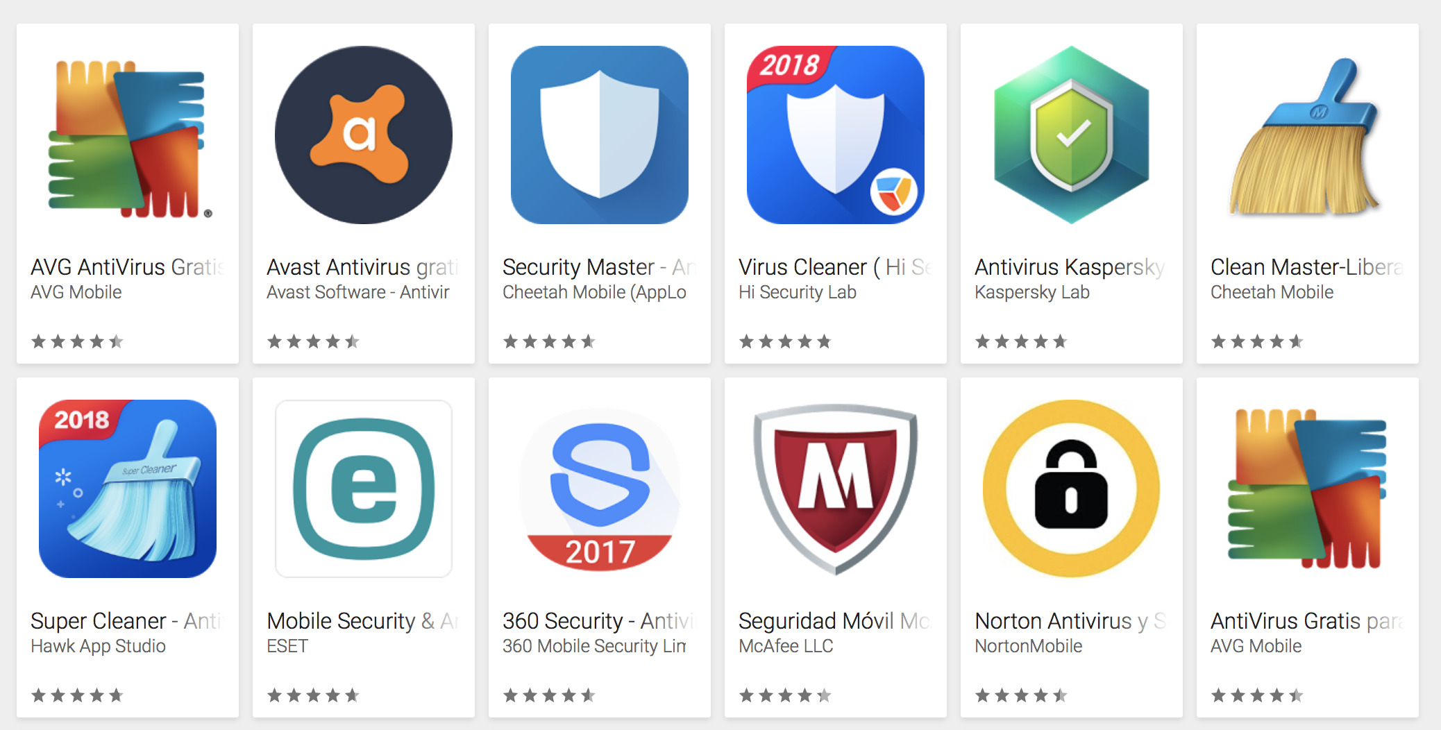 Con sólo una búsqueda en la Play Store con la palabra «antivirus», nos topamos con varios resultados. Tenemos varias versiones móviles de antivirus reconocidos para Windows: McAfee, Avast, AVG, Eset.. Muchos se han apuntado a lanzar una versión para móviles. Pero creo que la mayoría de veces son una carga más que una protección.