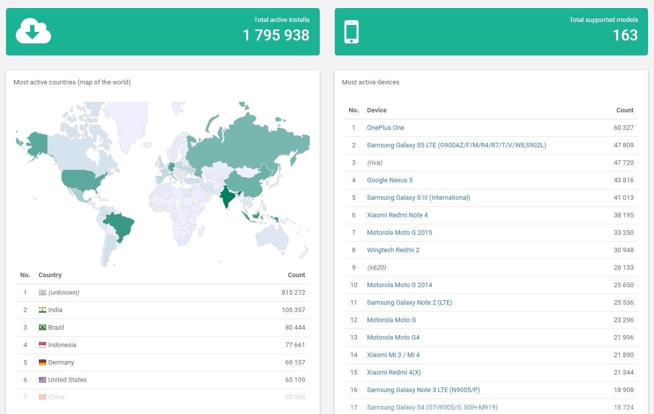 La lista de usuarios activos de Lineage OS es pública, y la podemos consultar a través del siguiente enlace. Lo cierto es que en los últimos meses no ha habido un gran crecimiento, por lo que la cifra se ha establecido en 1,8 millones de usuarios que siguen estando interesados en esta particular ROM. Si vemos la lista en detalle, es fácil entender qué está ocurriendo, y por qué sigue existiendo un bloque fiel de usuarios.
