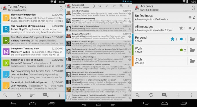 Configurarlo es muy sencillo, el proceso es prácticamente idéntico al del cliente de correo nativo, con pequeños cambios para seleccionar las carpetas de borradores, enviados, papelera y bandeja de salida. Una vez hecho este proceso, que es igual para todas las cuentas, el listado de mensajes es bastante más compacto que el del cliente de Android, lo que es de agradecer. Después el manejo general es sencillo pero si nos ponemos a explorar las decenas de menús y configuraciones encontraremos que es una aplicación con muchas posibilidades.