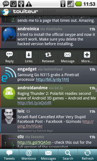 Pero ninguno me acababa convenciendo: HootSuite y Twicca requieren 1.6+, con lo que no servían para mi Hero. TweetCaster era muy lento. Twitdroid era muy complejo, pero con pocas cosas útiles. Y además ninguno tenía un widget decente, así que también necesitaba tener instalado Twidgit Lite.