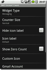 El widget tiene varias opciones, por ejemplo podemos seleccionar si queremos que el icono sea de mensajes SMS, de gMail o de llamadas, también el tipo de icono, Clásico, Eclair o el del HTC Hero, opciones más que interesantes si queremos customizar un poco nuestra home. El widget ha ido mejorando versión tras versión y también permite que mostremos el contador a 0, eliminar y modificar la etiqueta de texto y poner más grande el contador del icono.