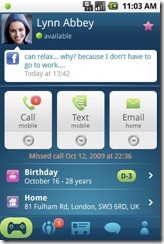 Una vez dado de alta en todas las redes sociales, podrás acceder a diferentes pantallas en la que obtendrás toda la información social de dicha persona mezclada:  sus tweets, cambios de estado, chats, fotos añadidas, etc… más o menos como el apartado social del Motoblur. Podrás también compartir localización con tus contactos y recibirás notificaciones de los cambios que desees. Todo ello muy personalizable. Finalmente cabe decir que podrás hacer una copia de seguridad para no perder todos los datos una vez cambies de móvil.