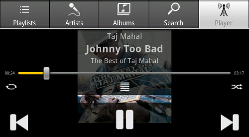 Tras esto puedes buscar la aplicación de Audiogalaxy en el Android Market o bien darle al icono que te saldra del logo de Android en la misma aplicación para ordenador. Una vez descargada podrás oír toda tu música via streaming, pero no solo eso, ya que el reproductor para Android es bastante completo y podrás crear listas, buscar por artista, por álbumes, etc.