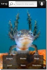 . La aplicación es bastante atractiva, simulando un escritorio del terminal, arriba tiene la típica barra de búsqueda y el fondo se puede cambiar por imágenes del propio buscador, en la parte de abajo se encuentran los distintos tipos de búsquedas: web, imágenes, mapas, noticias,… Es una aplicación muy completa, en los mapas te pueden dar direcciones, puedes buscar las películas y te dirá lo cerca que está un cine y en general la aplicación está muy conseguida y me ha encantado visualmente, pudiendo cambiar la imagen de fondo deslizando el dedo. Además también dispone de un widget imitando a la búsqueda de Google pero en negro. Lo malo es que sólo está disponible en EEUU pero en el articulo enlazado antes (aquí) lo podéis descargar.