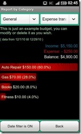 Por otro  lado tenemos Budget Tacker (arriba dcha)una aplicación que no destaca por su interfaz precisamente pero que tiene bastante potencial. Aunque está en español la moneda usada es el Euro y además tiene algunas cosas interesantes. Por un lado, creas un presupuesto y a él le realizas operaciones de income (ingreso) o expense (retirada), pero no sólo eso, tenemos categorías que será en los que gastemos el dinero. Podemos ver la lista de transacciones filtradas por fecha así como gráficos de en qué se ha gastado (Reports) organizados por categorías, de esta manera podremos ver en que gastamos más para poder ahorrar. Un punto negativo es que tiene un banner de publicidad, aunque tampoco molesto mucho y destacar su pobre interfaz.