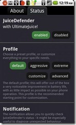 Por otro lado está la aplicación JuiceDefender – battery saver, una aplicación que tiene una interfaz muy usable, haciendo que la experiencia de usuario sea bastante buena. Esta aplicación nos da a elegir perfiles de ahorro desde “default”, pasando por “agressive” y terminando por “advanced”, pero no sólo hay estos tres sino algunos más. Entre las cosas que hace automáticamente es matar procesos (hay una lista blanca para no eliminar aplicaciones que le digamos), cambiar la frecuencia de la CPU (sólo para usuarios root), el brillo y otras cosas que manejará de forma transparente. El tema de las conexiones también las puede activar y desactivar, pero sólo si tenemos intalada la aplicación JuiceDefender antes mencionada. Un complemento ideal para ahorrar un poco más de batería.