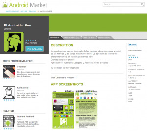 Pero, si cabe, lo aún más innovador ha sido el sistema de instalación. Ya lo habíamos visto anteriormente en otros markets como appbrain, pero por fin aparece en el oficial: la instalación remota. Una vez hemos navegado por el Market y encontrado la aplicación que queremos, sólo tenemos que pulsar sobre «Install» y automáticamente se instalará en nuestro teléfono, sin tener que hacer nada más. Para ello tenemos que estar logueados en el Market Web con la misma cuenta que en nuestro Android, nada más. La identificación detectará cuántos teléfonos tenemos usando esa misma cuenta, y nos dará a elegir en cuál de ellos deseamos instalar una determinada aplicación mediante un pop-up. Aquí tenéis un vídeo que hemos grabado para vosotros en el que podréis ver cómo se hace y cómo funciona: