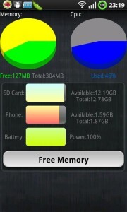 Empezando por el principio. Esta función nos muestra rápida y claramente el porcentaje de memoria RAM libre, y la CPU ocupada en ese mismo instante. Esta información está actualizandose constantemente, y podemos observarla en los gráficos tipo pastel que nos las muestra. Justo debajo se nos muestran los datos exactos. En la parte inferior de la pantalla, disponemos de información sobre la memoria SD ocupada o libre, la memoria interna, y la batería. Todos ellos también con los datos numéricos justo al lado. Para finalizar tenemos también un botón para liberar memoria rápidamente.