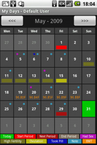 Empezamos con la más «simple», pero no por ello menos útil. Con My Days podremos llevar un control completo de los días de menstruación, ovulación, fertilidad, así como poder añadir notas a días concretos, cuándo hemos mantenido relaciones sexuales con nuestra pareja o si ha sido tomada la píldora. Su configuración es de lo más sencilla: Primero debemos crear un usuario y añadir los parámetros básicos como el período aproximado entre cada período (valga la redundancia), así como los días de duración de éste. Podemos cambiar también el idioma, mostrar la leyenda, la temperatura corporal, cambiar los colores, etc. Una vez lo tenemos configurado basta con añadir el día en el cual ha venido «la mujer de rojo» y automáticamente empezará a funcionar la aplicación; en ella podremos ver cuando son los días más fértiles, los días de ovulación o los días que hemos «jugado» con nuestra pareja. Pero si además marcamos el día en que ha terminado la regla, la propia aplicación irá haciendo una estimación más exacta de la duración del período basándose en los datos introducidos, para afinar aún más. Como hemos dicho, pulsando sobre el día deseado podemos añadir notas, temperatura, y demás opciones para llevar un control más completo. La interfaz es algo simplona, mostrando únicamente el calendario con colores, pero es bastante intuitivo y práctico. Además incluye 2 widgets donde nos puede mostrar los días restantes hasta el inicio del próximo período, ovulación o un mini calendario.