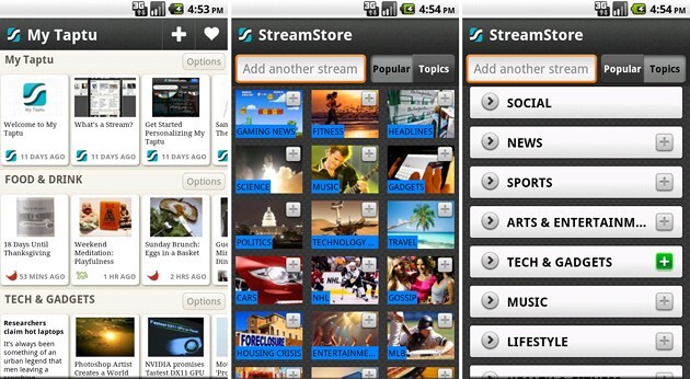 La principal novedad que aporta My Taptu, es que permite añadir como «stream» de noticias todo lo que ocurre en nuestras cuentas de Facebook, Twitter y LinkedIn, con lo que, con solo una aplicación, controlamos nuestros Feeds, Facebook, Twitter y LinkedIn. La aplicación ha sido publicada recientemente en el Android Market y esta disponible de forma gratuita, os dejo el enlace a la página web del Android Market donde podeis descargarla a vuestro teléfono.