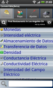 Una de las aplicaciones mas completas. Tenemos una larga lista de medidas, en la que podemos seleccionar la que necesitemos. Después nos encontraremos con una lista de unidades de medida, pulsamos en uno e introducimos la cantidad. Automáticamente se transformará la medida.
