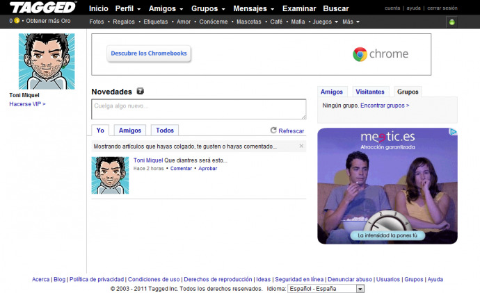 Tagged es el nombre de la red social que nos ocupa hoy, y el funcionamiento básico es como el de Facebook o Tuenti (supongo, ya que no la uso). Tenemos nuestra lista de contactos, un buscador o la lista de grupos de los que pertenecemos. Su uso a través de la web es al principio algo caótica; mucho banner, opciones activadas que nos despistan o una lista de «aplicaciones» por defecto que nos llenan la parte lateral…pero una vez desactivado todo eso, se queda en una pantalla más o menos limpia como podéis ver en la imagen inferior.