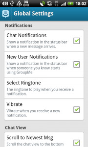 Una vez realizado el paso anterior, lo que podemos/debemos hacer para poder comenzar a charlar con nuestros amigos, será entrar en configuración y comprobar que está activa la opción de sincronizar nuestros contactos con GroupMe. Además de esa, puedes encontrar otras como la configuración de notificaciones, la vista del chat, etc