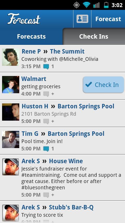 Pero la gracia de Forecast no es la de hacer Check-In normales. La gracia viene justamente en la pestaña con su nombre. Forecast significa previsión, y justamente eso es de lo que se trata. Podemos anunciar lo que tenemos planeado hacer. Por ejemplo, podemos decir que estaremos en X sitio a las 20:00h. Esto no se publicará en Foursquare, aunque nuestros amigos de Forecast sí podrán verlo. Cuando llegue la hora, nos saltará una notificación, permitiéndonos hacer Check-In en ese lugar si queremos.