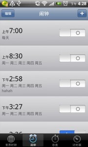 Pues eso mismo, la aplicación «copiada» del reloj de iOS. El aspecto está muy pero que muy conseguido, ya que es prácticamente idéntica a la original de iOS. La pega que tiene, tal y como os comentábamos antes, es que tiene parte del texto de la aplicación en Chino, y salvo que sepáis leer Chino Mandarin, os supondrá un problema.