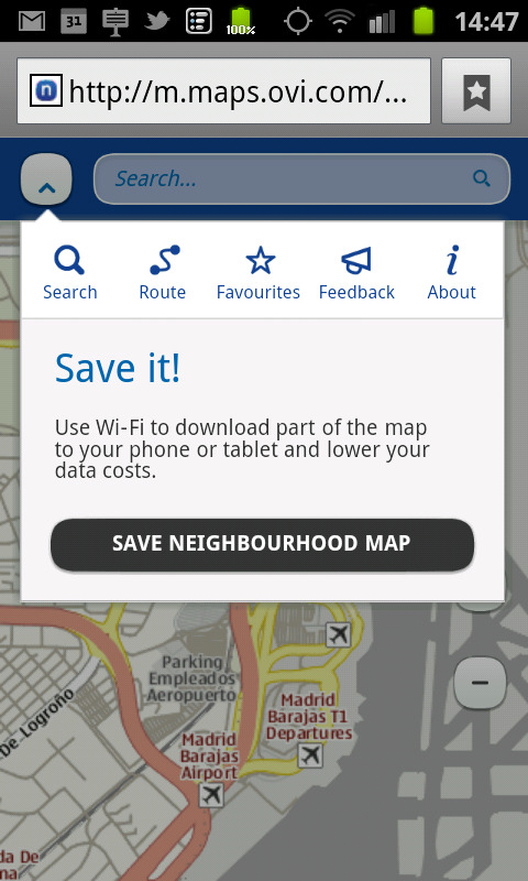 Para acceder a Nokia Maps desde nuestro Android tendremos que navegar a http://m.maps.ovi.com y se abrirá la aplicación web que nos permite hacer lo típico. La sorpresa vendrá al abrir la pestaña de arriba a la izquierda, pues nos permitirá pulsar sobre el botón Save Nighbourhood Map, que es el que guardará los mapas en nuestra memoria del teléfono y luego nos permitirá acceder de forma offline.