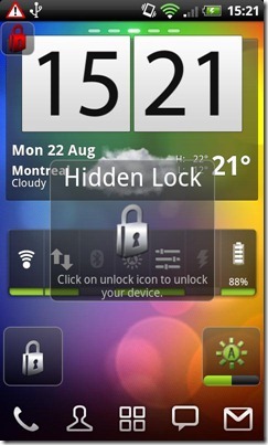 Hidden Lock es una aplicación que pondrá un botón en nuestra pantalla para bloquear el teléfono y otro para desbloquearlo. Con un pequeño añadido, que este segundo botón (el de desbloqueo) es completamente invisible. Es una idea muy sencilla y genial; se trata de lo siguiente: