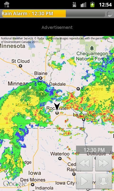 Ésta aplicación es realmente interesante y a la vez muy curiosa. Como su nombre indica, Rain Alarm(alarma de lluvia), es una aplicación en la que se nos facilitará con mapas de radares animados si va a llover o no. Me explico, Rain Alarm nos localizará en el sitio o en el punto en el que estamos mediante Google Maps.