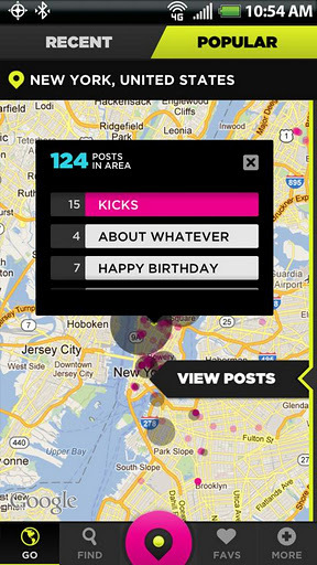 GO aterrizó el viernes en el Android Market, pero desde noviembre también se puede encontrar en la App Store de Apple.  Es una aplicación muy curiosa, nos permite compartir imágenes, vídeos, audio… mediante la geolocalización de este contenido y de forma anónima, que es verdaderamente su elemento diferenciador.