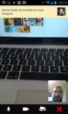 Una vez que lo hayamos iniciado tendremos varias opciones dentro de la pantalla, las nuestras se centrarán en la parte inferior del terminal, en las que podremos activar o desactivar el micro, activar o desactivar el vídeo y cambiar a cámara delantera o trasera. Por último la cruz roja, que nos permitirá cerrar el hangout cuando lo deseemos.