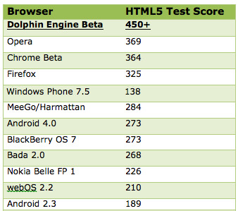 Como datos aportan también que esta beta es entre 5 y 10 veces más rápido que el navegador por defecto de Android (el de ICS se entiende), un 100% más rápido que Chrome (aquí añaden con cierta guasa un «a veces») y una puntuación de 450 puntos en un reconocido test de HTML5. Como a muchos ese numerito no nos dice nada hemos decidio incluir una tabla con la puntuación de diversos navegadores móviles. Estos datos son muy a tener en cuenta por lo que habrá que seguir esta nueva versión de Dolphin que pude convertirle en el mejor navegador Android del momento.