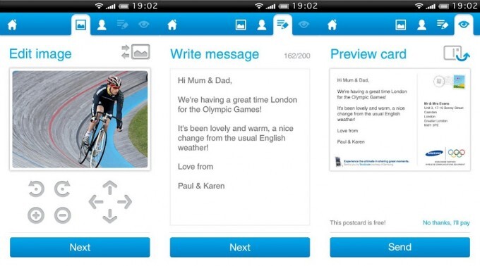 Pero la mejor parte viene ahora: normalmente el enviar una postal a través de ellos suele costar una cantidad concreta de dinero, pero con motivo de los Juegos Olímpicos, que se realizan en Londres este año, Samsung se ha aliado con Touchnote para dar postales gratis a todo el que las pida (no, según ellos no existe ningún límite de tarjetas, ni ningún tipo de limitación de dirección de envío). Lo único que diferenciará las postales gratuitas de las de pago es un poco de publicidad por parte de Samsung: las imágenes (podemos elegir entre varias con motivo de los Juegos o subir nosotros una propia) se seguirán imprimiendo en la máxima resolución posible.