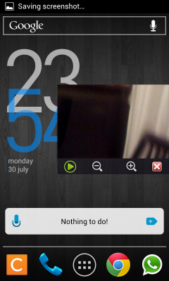 La interfaz de esta ventana es bien sencilla, con un tamaño ajustado al vídeo y controles básicos en la parte inferior que permiten aumentar o disminuir el tamaño de la misma y cerrarla. Además se puede pausar y reanudar la reproducción simplemente tocando en el centro de la ventana con el dedo. Para activar esta función basta con reproducir el vídeo de forma normal y pulsar el botón «Home» mientras la reproducción está en curso. Esto nos llevará a la pantalla principal de nuestro launcher y encontraremos además la ventana flotante del Mobo Player, tal y como hemos visto en el caso de la aplicación de Samsung. La reproducción en este modo es fluída y permite el uso del terminal de forma fluída incluso en terminales de bajas prestaciones (hablo por mi experiencia con un HTC Desire Z con ICS ).